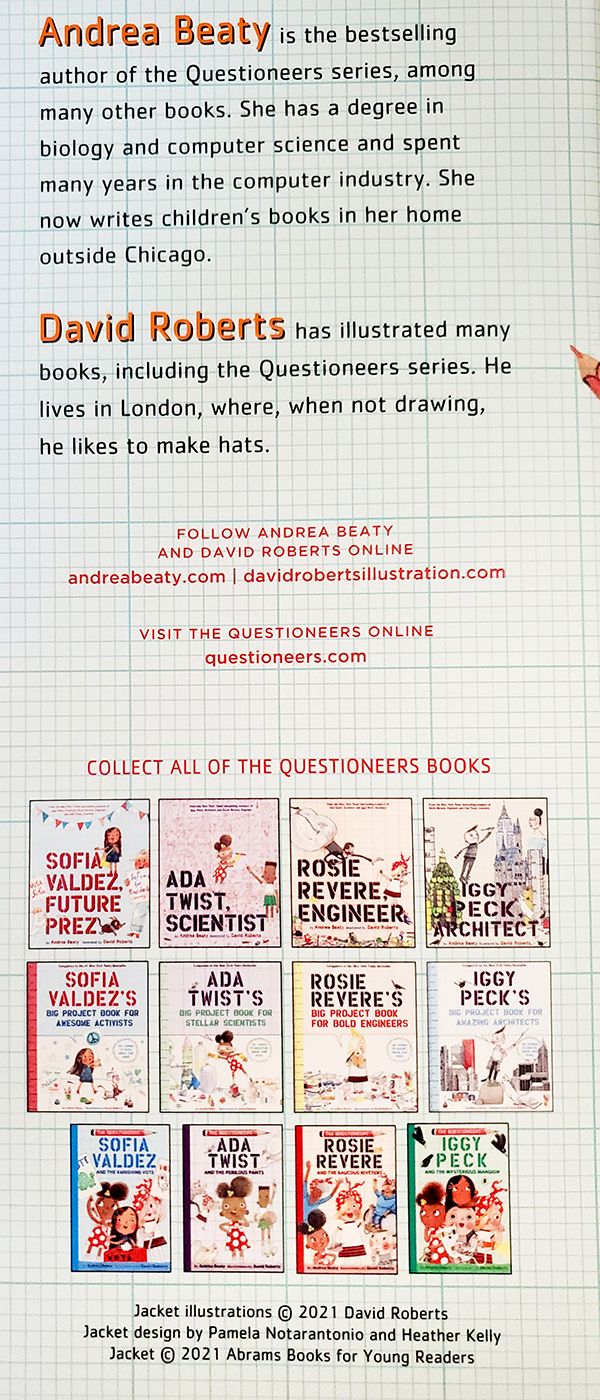Written by Andrea Beaty and illustrated by David Roberts, this book is the fifth installment in the bestselling Questioneers series; the Questioneers chapter book series includes titles like Rosie Revere and the Raucous Riveters and Ada Twist and the Perilous Pants, while the Questioneers picture book series includes titles like Sofia Valdez, Future Prez.