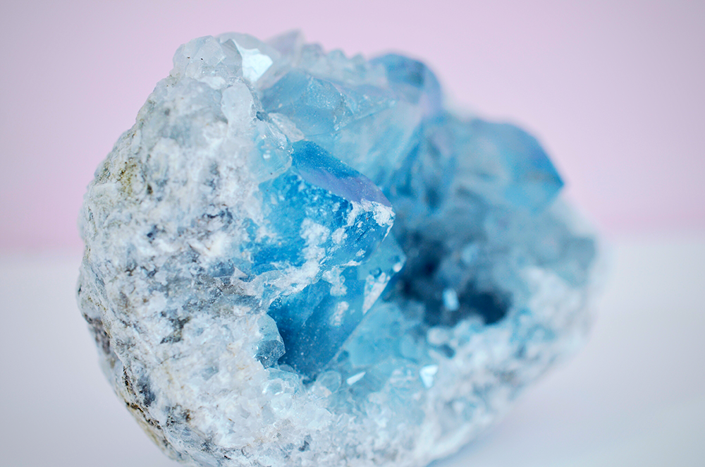 Celestite is a popular crystal for boosting productivity because it is calming and helps relieve stress and anxiety, two common blocks to productivity.