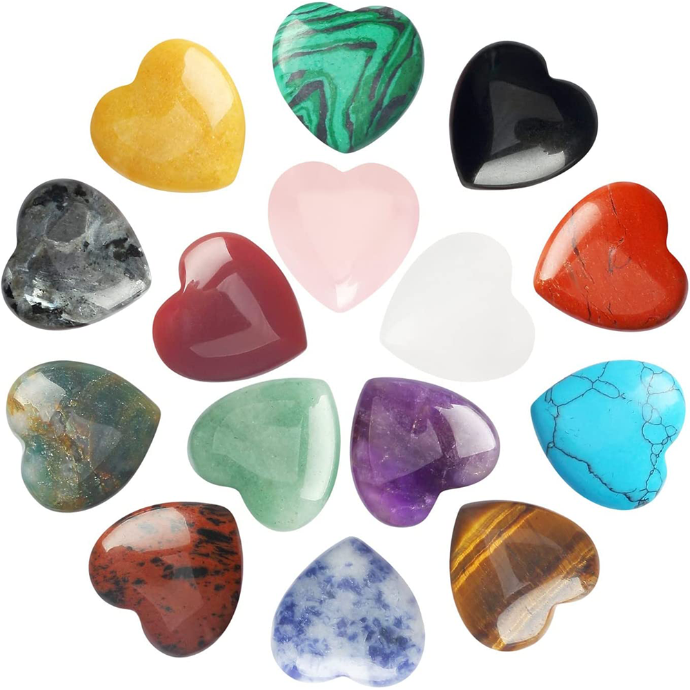 These crystals come in hearts of carnelian, red jasper, tiger's eye, yellow agate, green aventurine, malachite, turquoise, sodalite, amethyst, rose quartz, labradorite, India agate, and clear quartz.