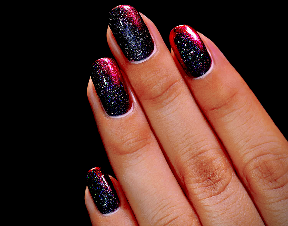 Holographic polishes are often top coats or accent nails, used to add a little extra pizzazz to your manicure.