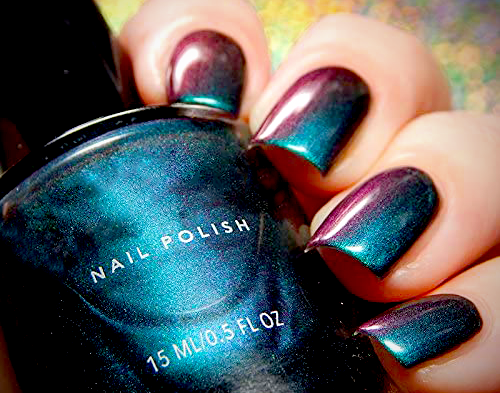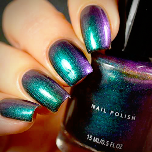 This vibrant color-changing polish contains a gradient of rich hues, starting with a green that transitions to teal and navy, and concludes with purple with hints of magenta and red.