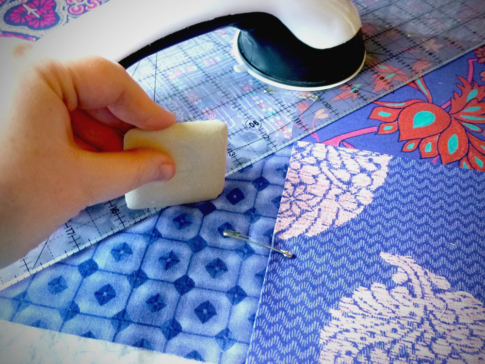A quilting starter kit should include a rotary cutter, cutting mat, fabric scissors, straight pins, seam ripper, marking pencils or pens, and tailor's chalk.