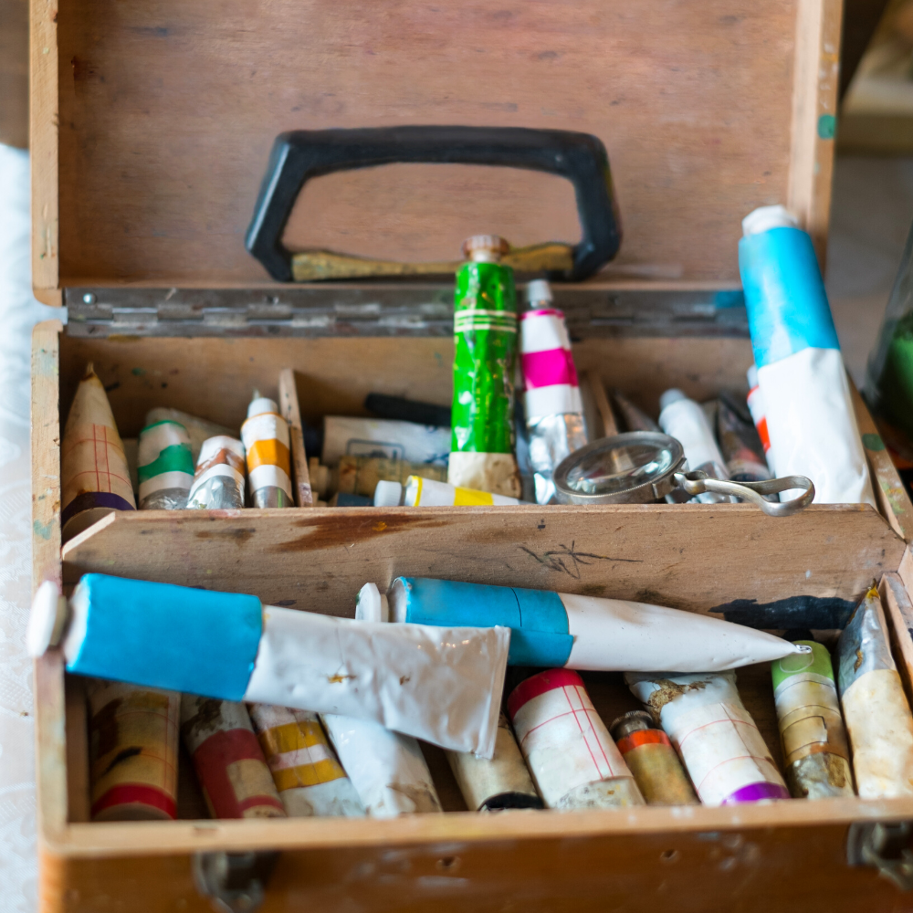 Other common supplies include palette knives for mixing colors, brushes of varying sizes and shapes for application, and canvas or other painting surfaces.