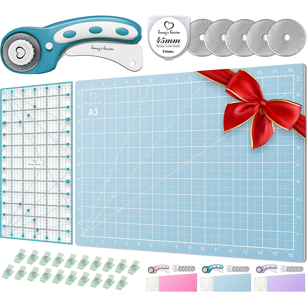 This all-inclusive set comes with a high-quality rotary cutter, a versatile cutting mat, and a quilting ruler.