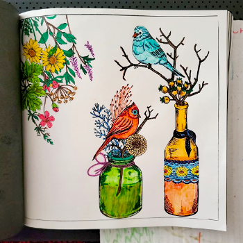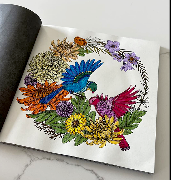 There are many coloring books available that feature calming imagery and patterns, such as birds alongside rolling waves.