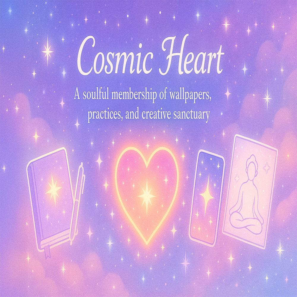 This membership is both a refuge and a resource — filled with dreamy wallpapers, guided practices, journaling prompts, coloring sheets, and seasonal rituals — all lovingly designed to uplift, inspire, and ground you. Whether you’re seeking creative spark, emotional healing, or simple moments of joy in your day, Cosmic Heart becomes a companion on your inner journey.