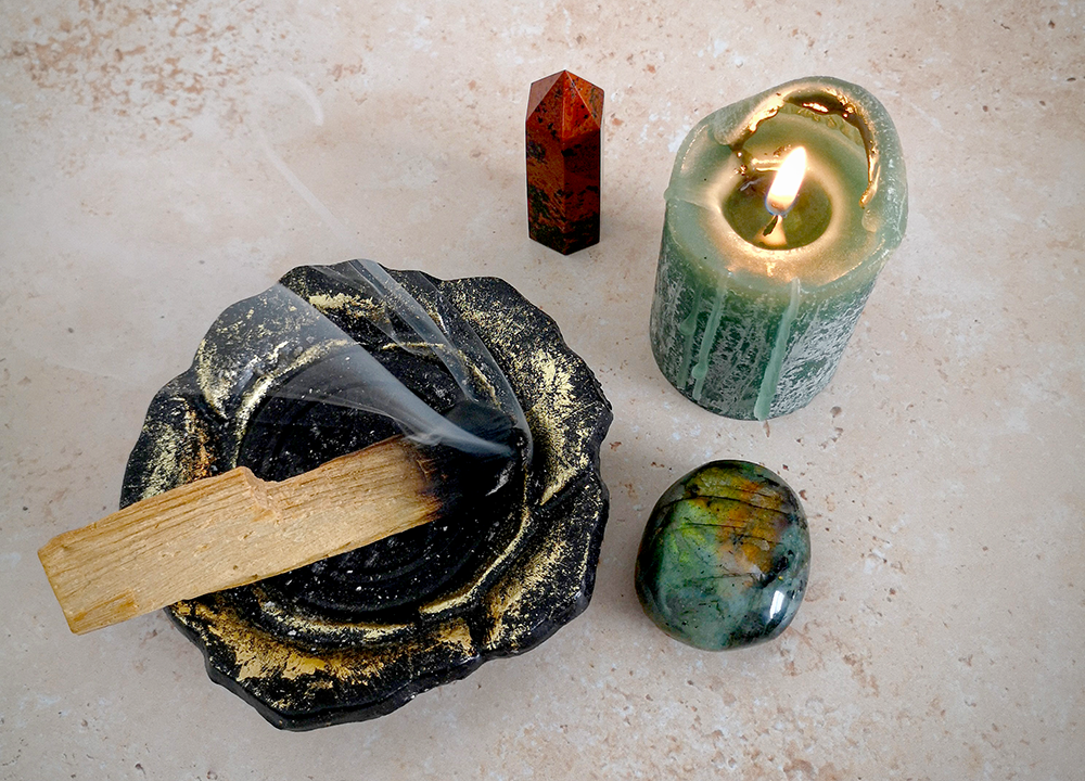 To smudge your crystal, simply light a sage stick or Palo Santo stick and waft the smoke around your crystal until it is fully engulfed.
