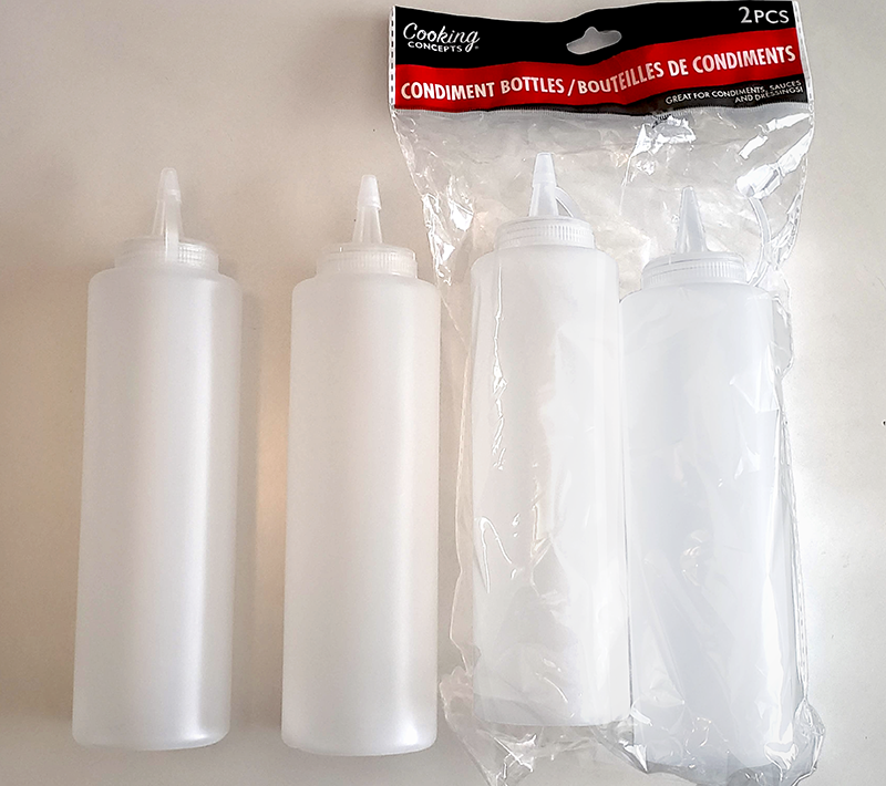 While you can purchase some from a craft store, the condiment bottles found at the dollar store work great and are much cheaper.