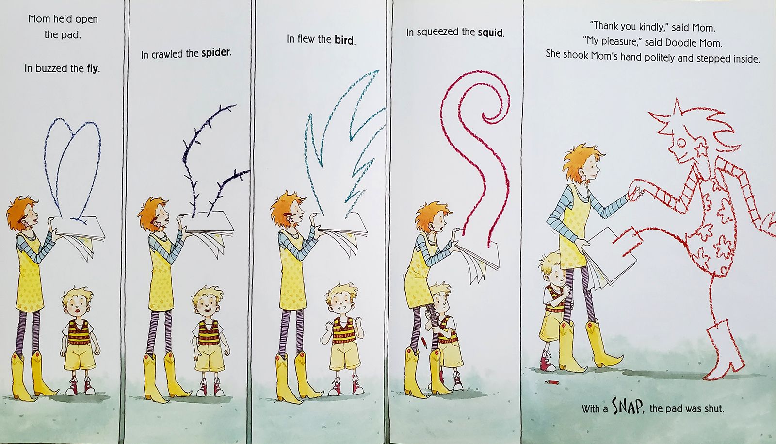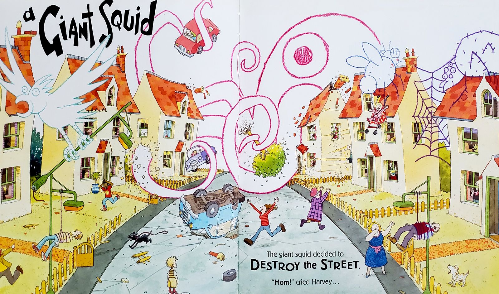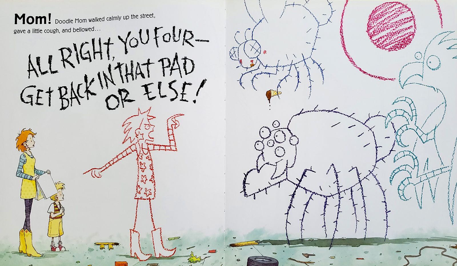 Even more trouble ensues, creation after creation, and the drawings run amuck; these scribbly crayon animals even include a giant squid!