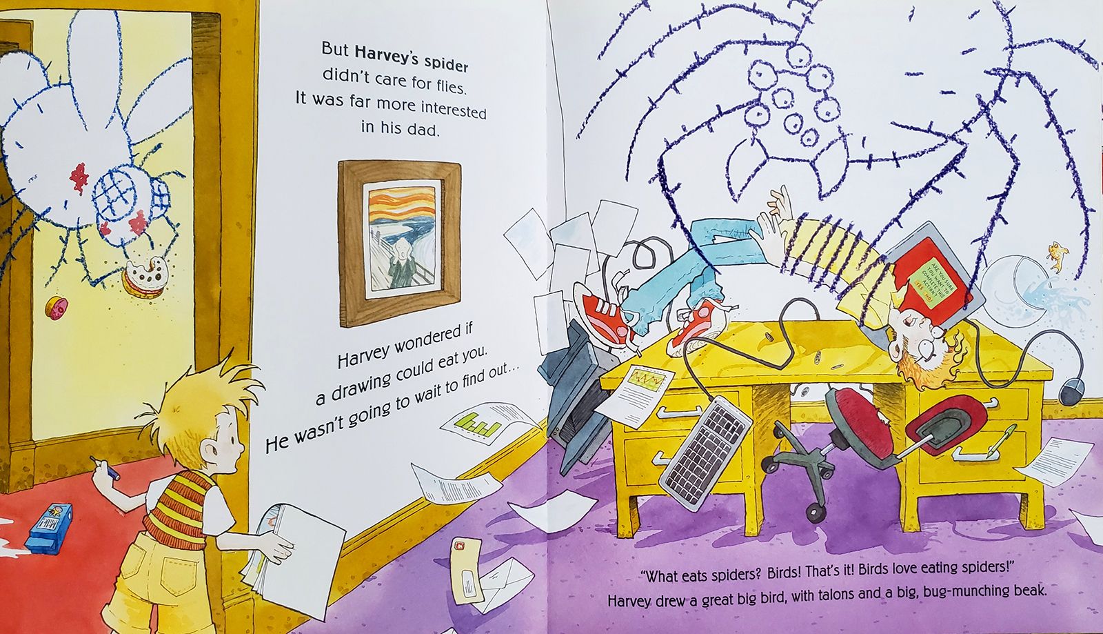 Drawn with a purple crayon, the spider proves to be especially unruly, and Harvey must come up with a plan of action to get rid of it and the other doodles.