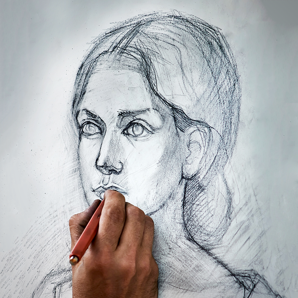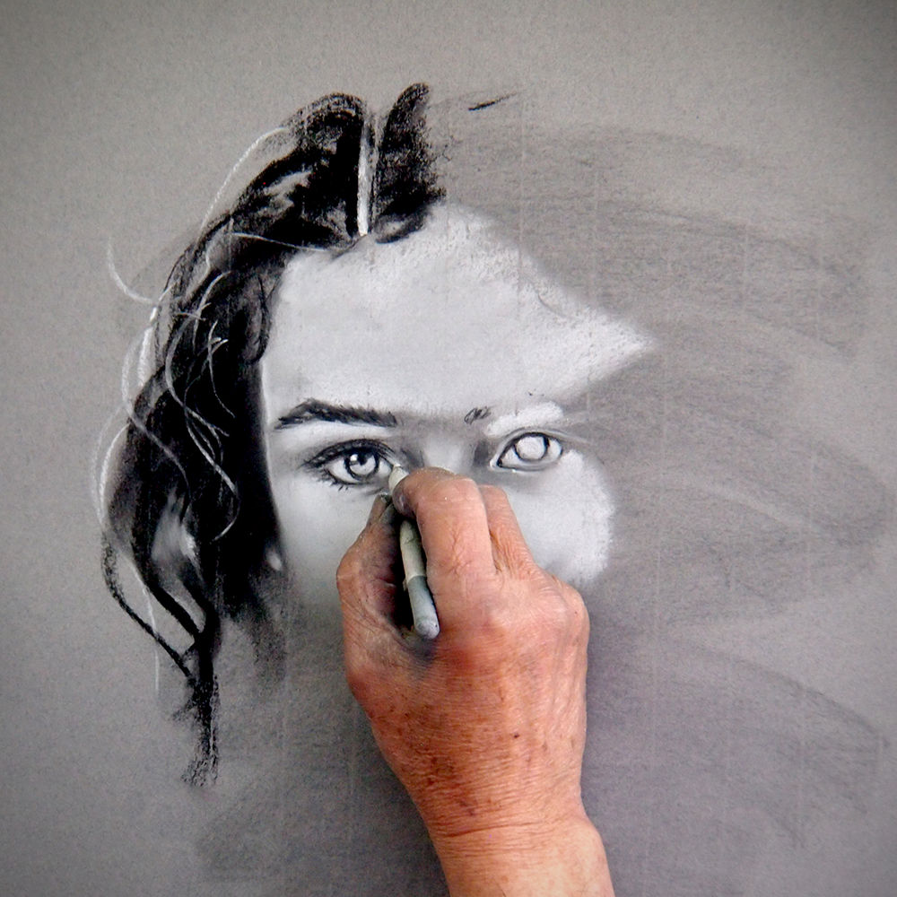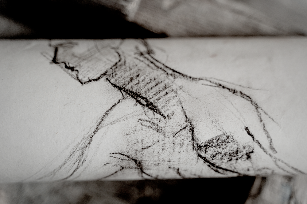 The first step is to create charcoal sketches, laying out your composition with a light touch.