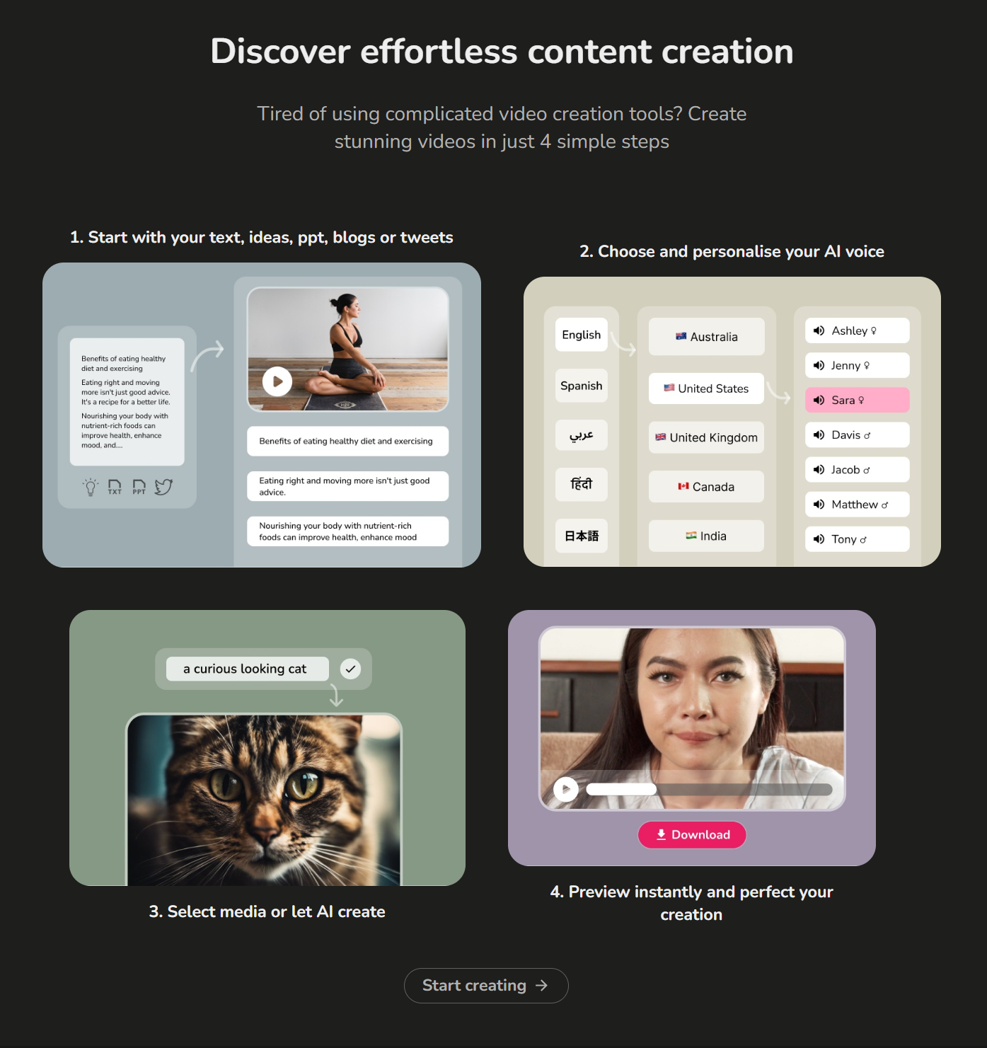 With Fliki.ai, creators can leverage AI voices and transform their ideas into beautiful videos in just four simple steps.