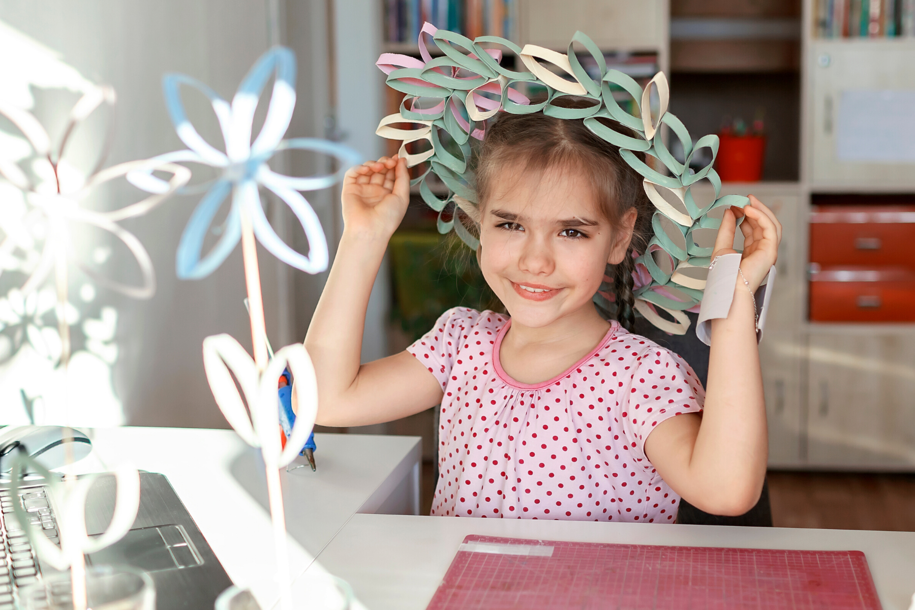 Plastic bottles, paper towel rolls, bottle caps, and toilet paper rolls can all be transformed into art.