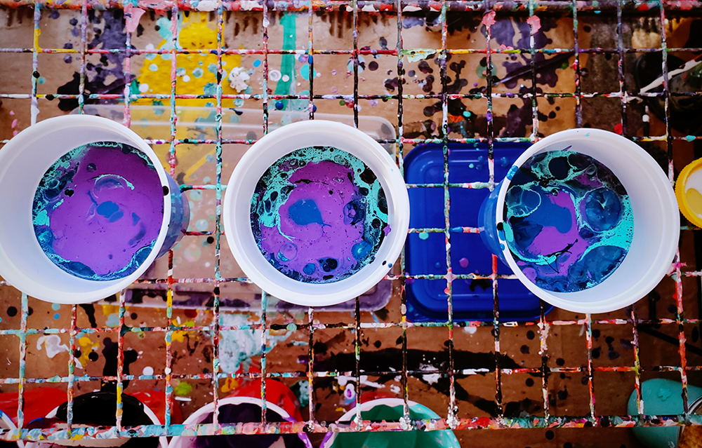 To mix your colors, pour a small amount of each color of paint into its own cup.