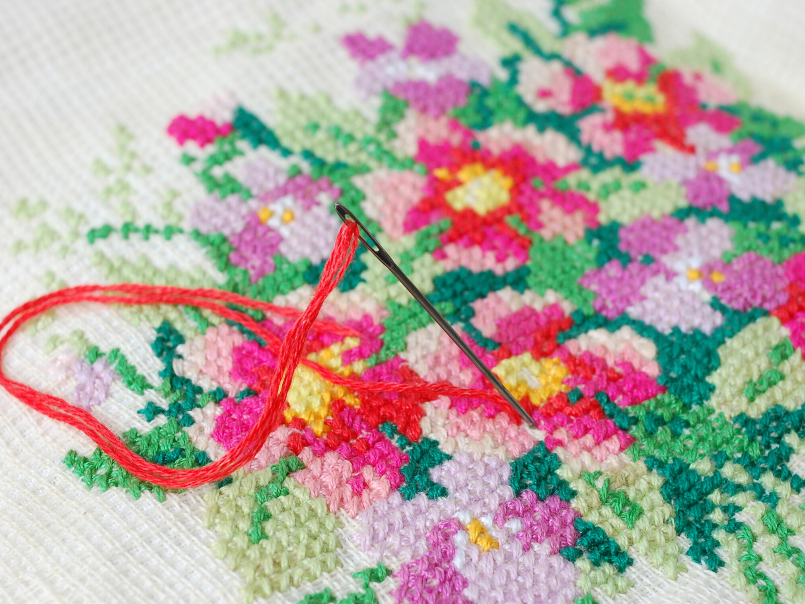 This type of embroidery is often used for samplers and needlepoint designs.