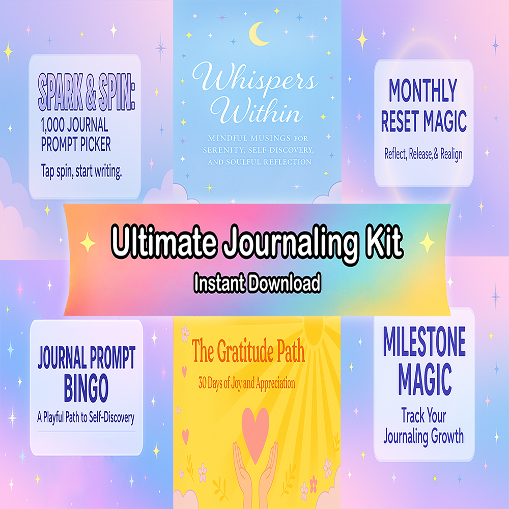 For those who want it all, the Ultimate Journaling Kit (Soulful Journaler’s Toolkit) is a complete ecosystem of reflection resources. It includes every tool mentioned above — gratitude journals, celestial-themed notebooks, monthly resets, milestone trackers, playful prompt games, and more.