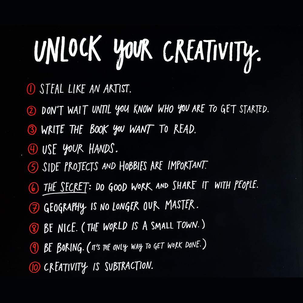 Take time to listen to music, write letters, read books or the New York Times, explore the meaning of words through the dictionary, try wordplay or crosswords, or watch documentaries to get your creative juices flowing to create something truly new and exciting.