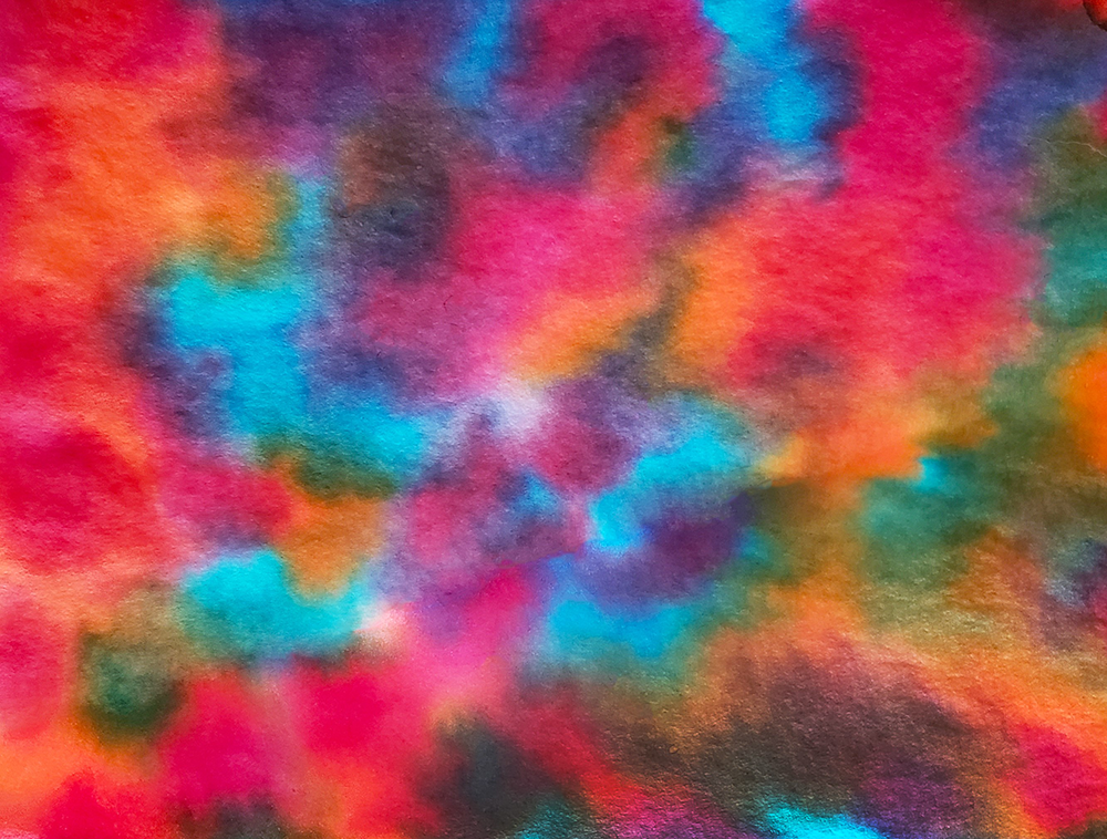 You can watch the liquid watercolor paints spread across water diffusing paper, creating tie dye effects.