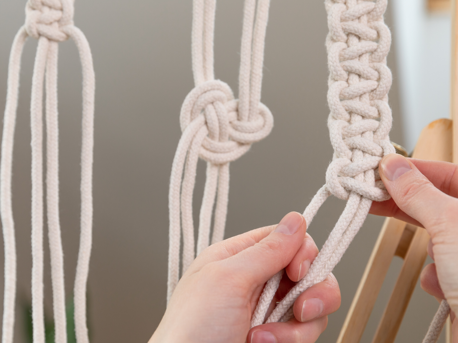 Your chosen knot technique will depend on the type of project you are making, such as a large macrame wall hanging, but some popular knot techniques include square knots, half hitches, and larkshead knots.