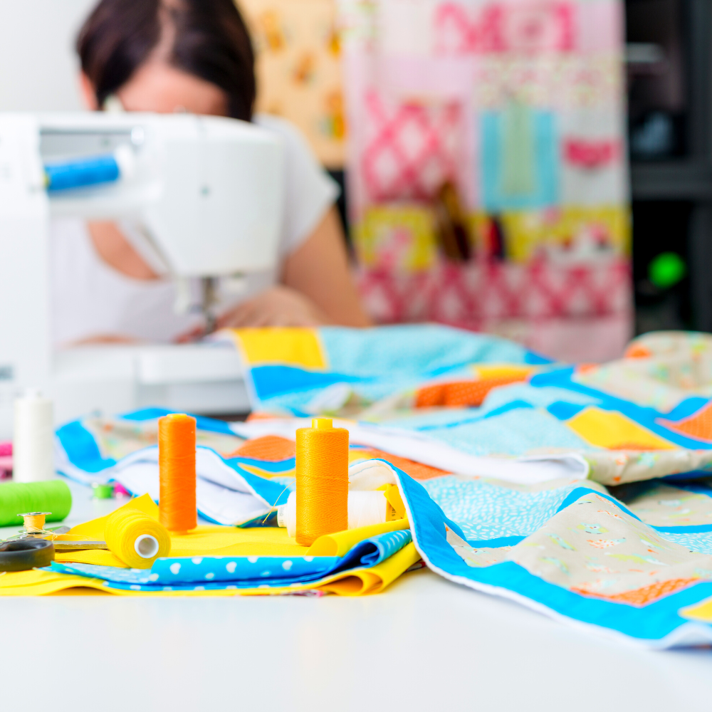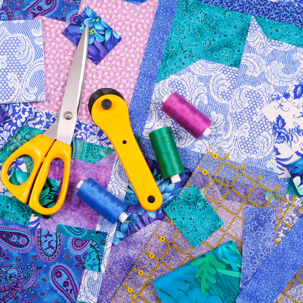 These include a rotary cutter, self-healing cutting mat, quilting ruler, thread, and of course, fabric!