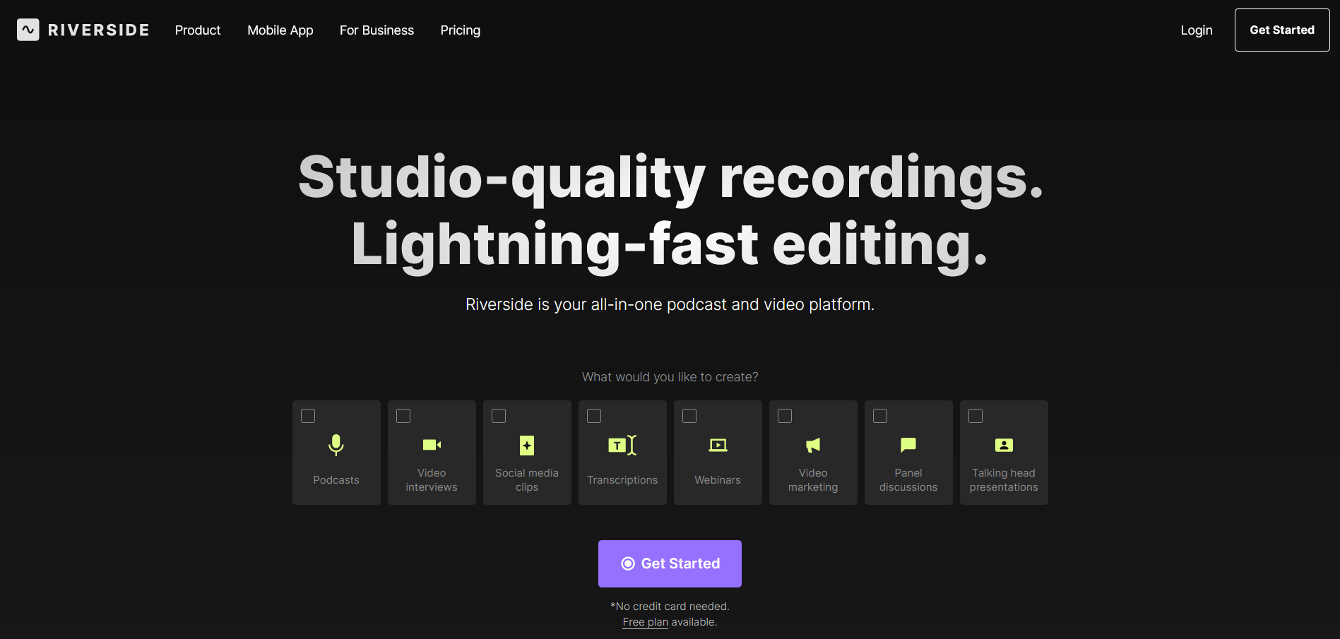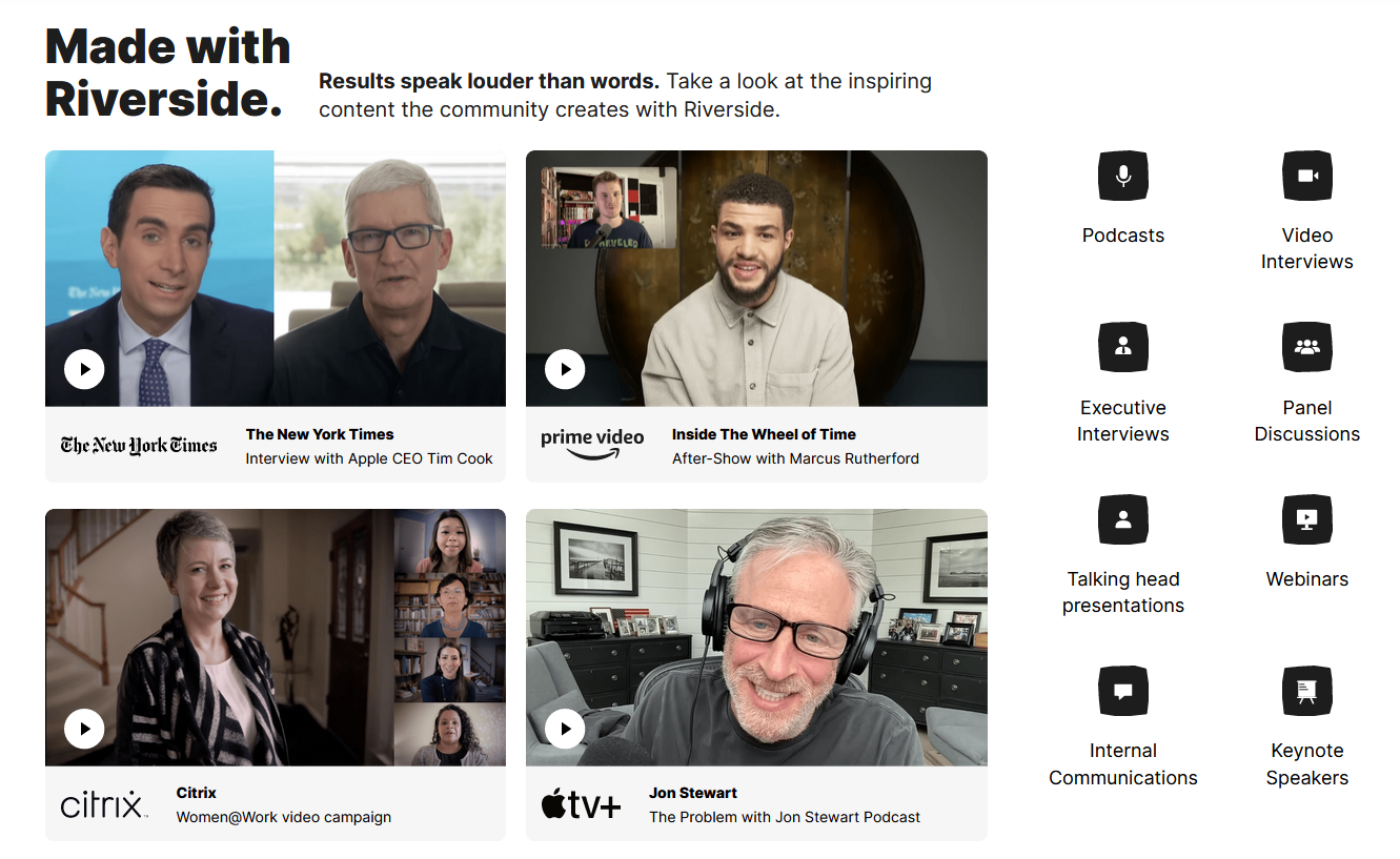With Riverside, you can create podcasts, video interviews, social media clips, transcriptions, webinars, video marketing, panel discussions, and talking head presentations with ease.
