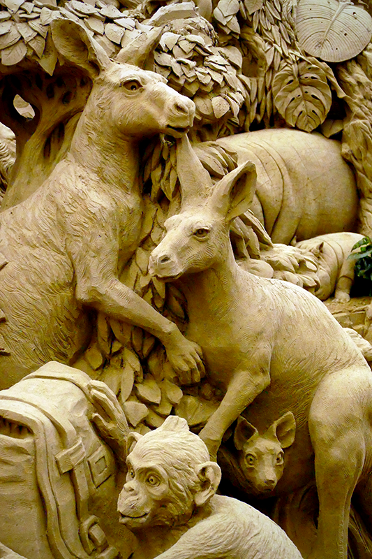 There are two main types of sculptures: pile sculpture, which is where the sand is built up into a design, and negative carving, which is where the artist carves away sand until the desired image is left behind.