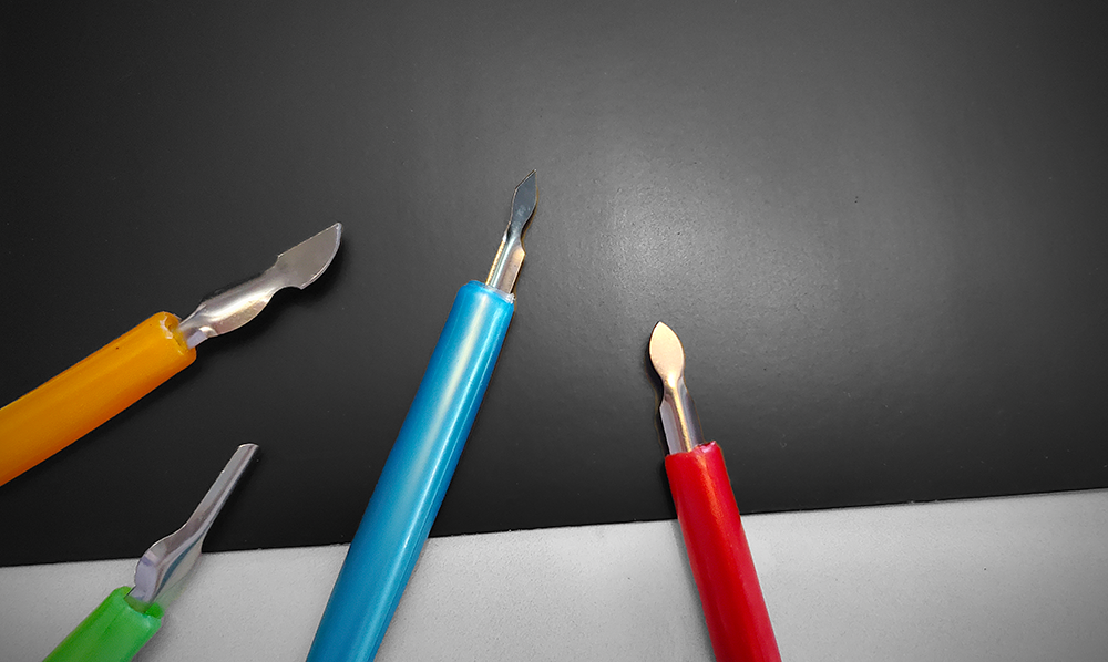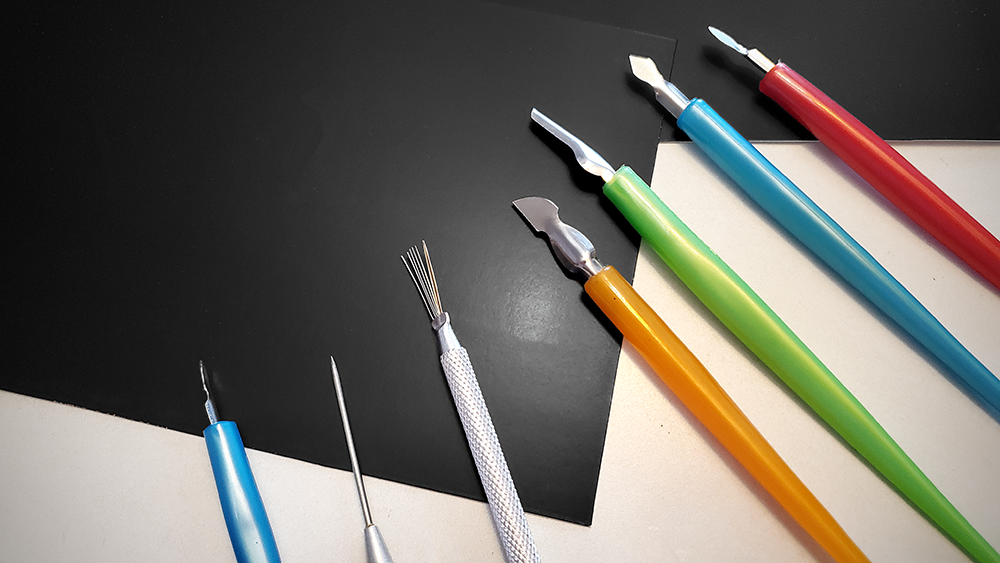 Scratch art tools can be wooden styluses, metal scrapers, plastic styluses, dual-tip scratch pens, engraving tools, and even clay tools, like feather wire texture tools and clay needles.
