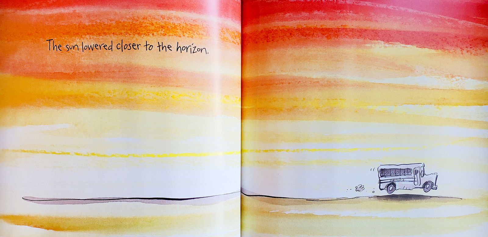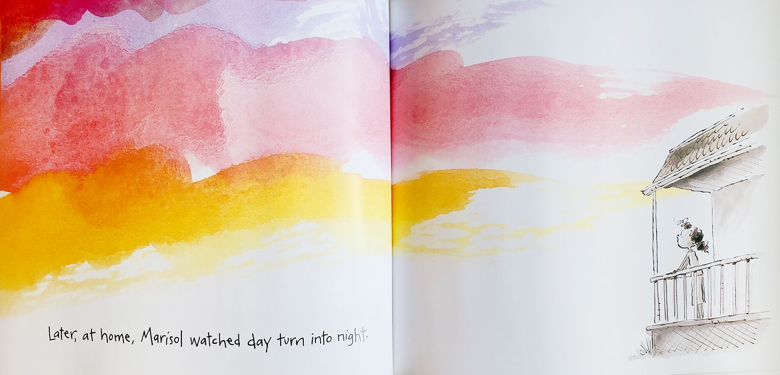 While staring out the bus window on her way home, Marisol notices the sunset sky and continues to ponder the color of the sky throughout the night, even as she dreams.