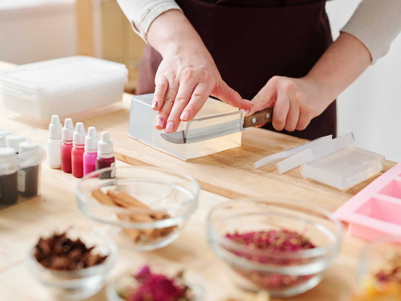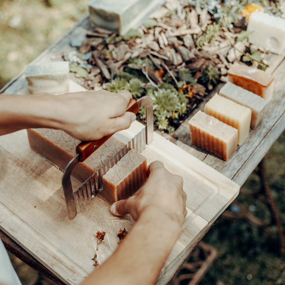 For a more professional finish, use supplies like soap molds, wooden loafslicers, and soap cutters to create even slices of soap.