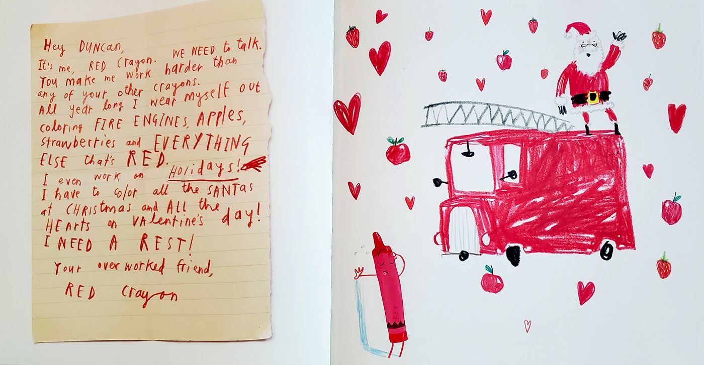 From overworked Red and underappreciated Beige (aka the "light brown crayon") to identity-confused White and embarrassed Peach crayon, each crayon pens a hilariously heartfelt letter expressing their woes and wishes.