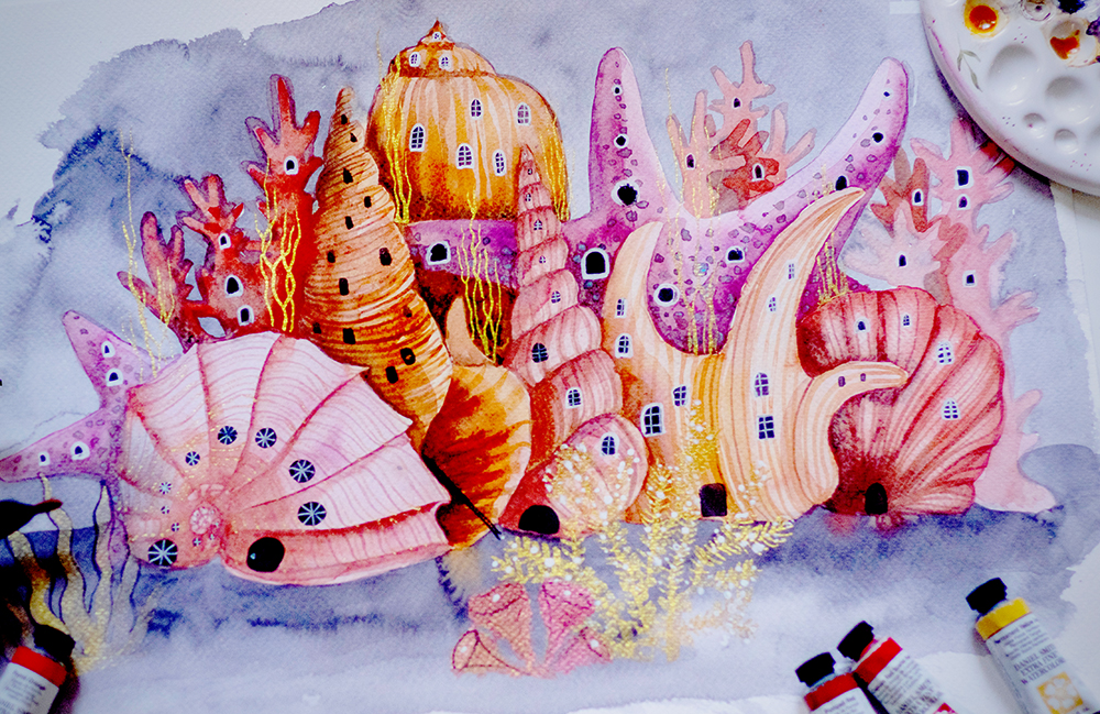 Her unique style emerged when she started playing with watercolors for fun after creating many oil paintings.
