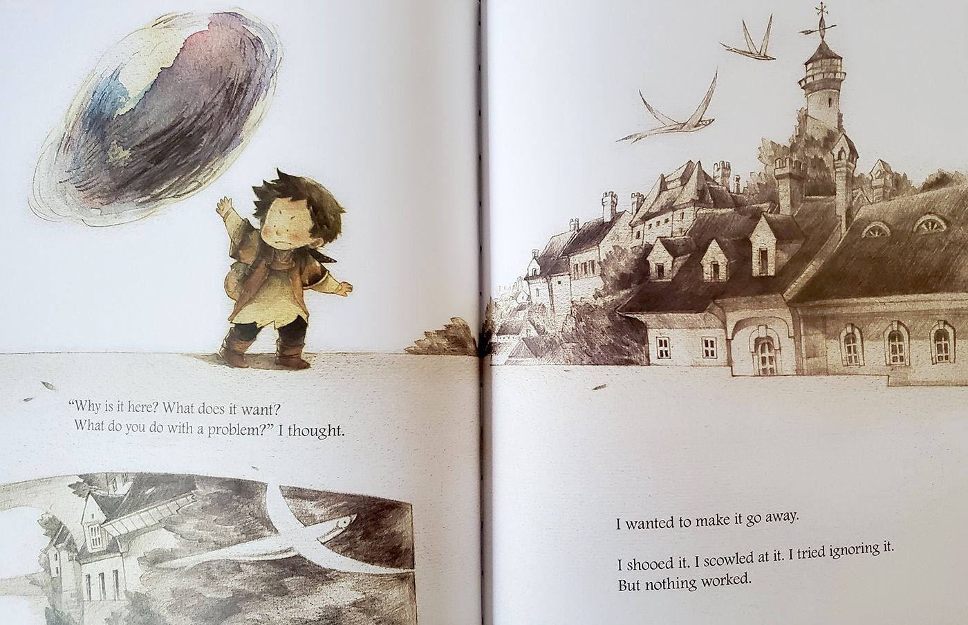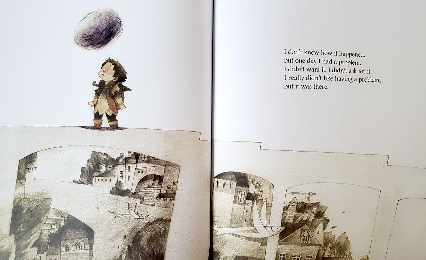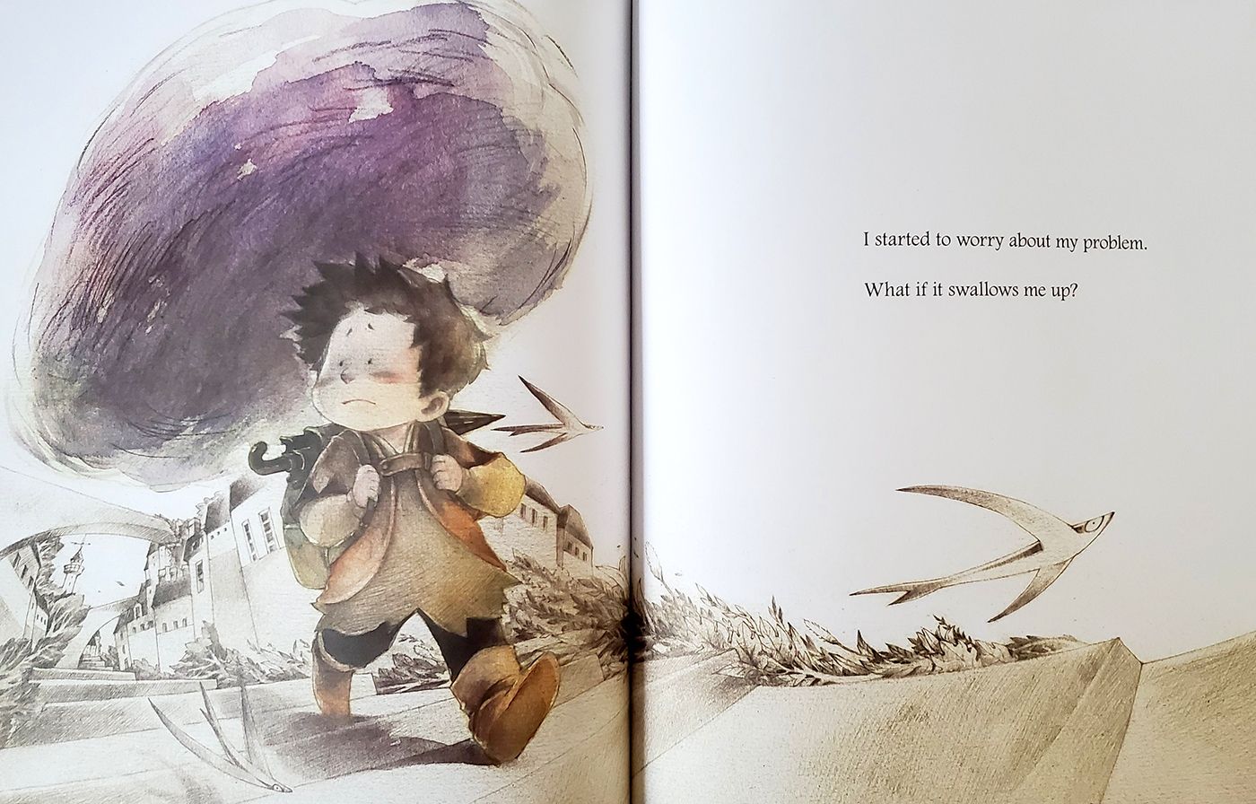 The "problem" is personified as a dark cloud that hangs over the boy's head, a clever metaphor that visually represents the boy's emotional state.