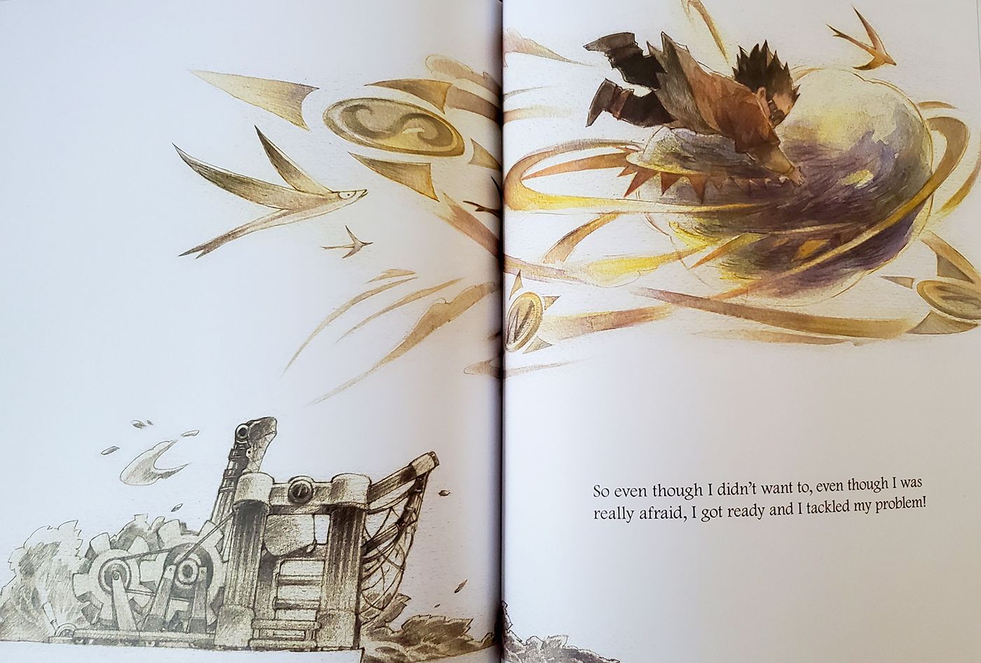 As the child decides and learns to face his problem, the illustrations shift, becoming brighter and more colorful, effectively mirroring his newfound courage.