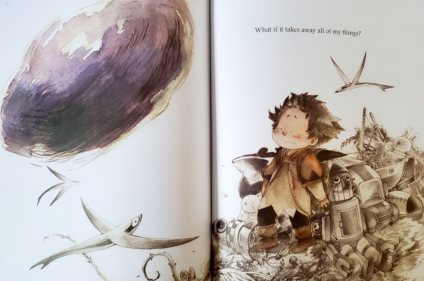 The dark, looming cloud is depicted in varying sizes, reflecting the boy's emotions and perceptions.